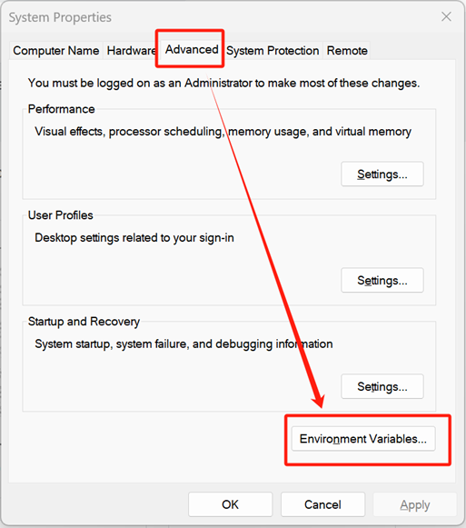 11. Then click “Advanced system settings”. Then please click Environment Variables under Advanced tab