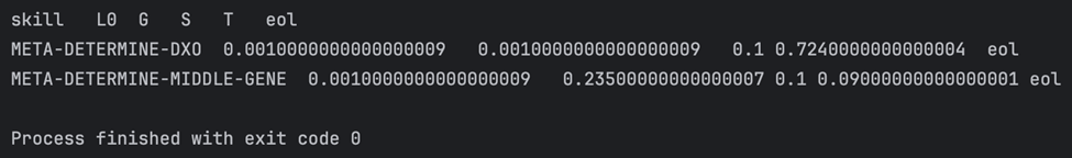 This output means: The best parameters for Skill META-DETERMINE-DXO are: L0 = 0.001, G=0.001, S=0.1 T=0.724 The best parameters for Skill META-DETERMINE-MIDDLE-GENE are: L0 = 0.001 G=0.235 S=0.1 T=0.09
