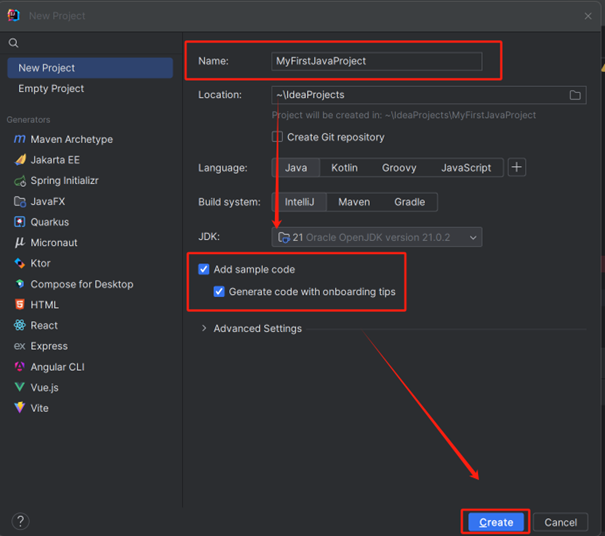 Then, change the name of your project, Check Add sample code(No need for future projects, just for beginners’ testing).