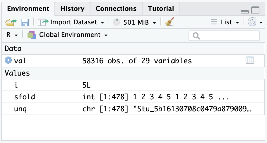 # Define the number of foldsk <-5# Get unique student IDsunique_students <-unique(val$Anon.Student.Id)# Randomly shuffle the student IDsshuffled_students <-sample(unique_students)# Split student IDs into k foldsfolds <-split(shuffled_students, cut(seq_along(shuffled_students), k, labels =FALSE))for (i in1:k) {# Add fold numbers to dataset. val$fold[val$Anon.Student.Id %in% folds[[i]]] <- i}